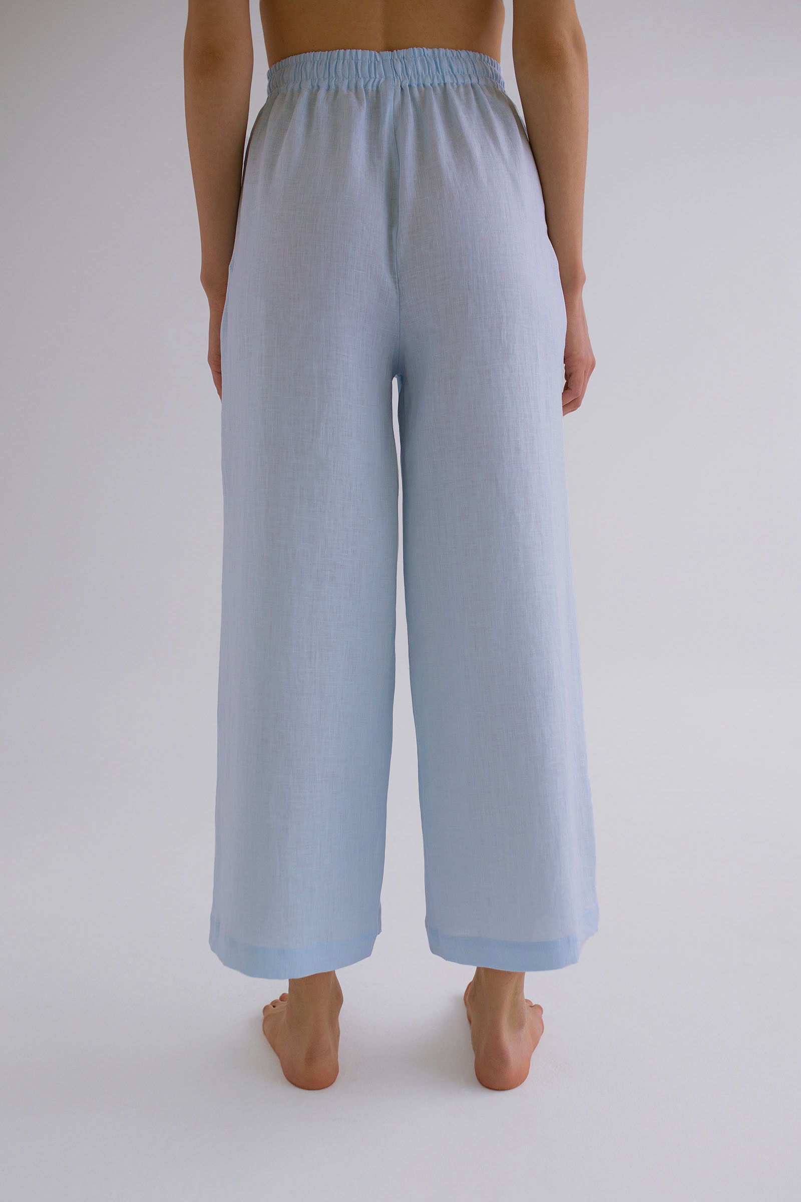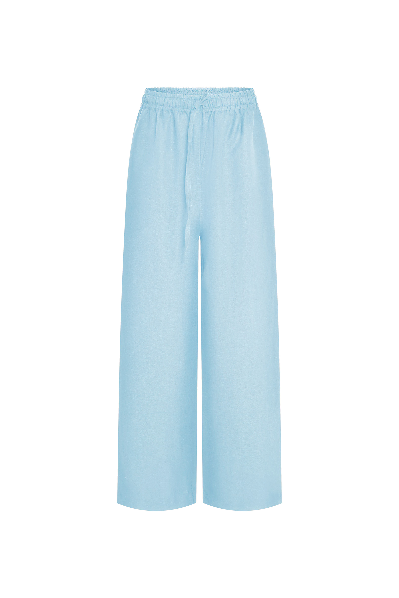 Свободные брюки прямого силуэта из натурального льна. Карманы в боковых швах, пояс на резинке с кулиской