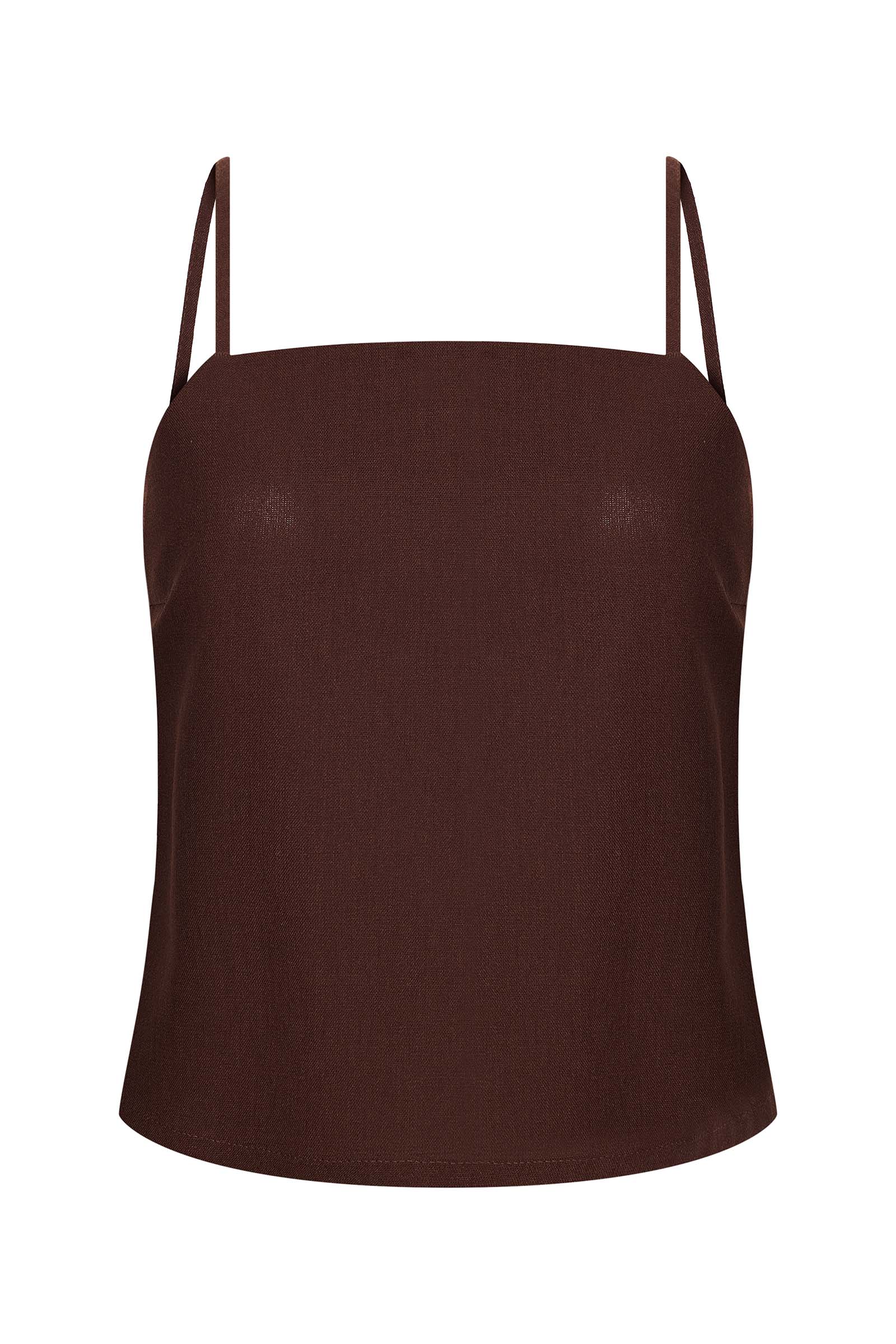 Базовый приталенный топ с глубоким круглым вырезом. Представлен в коричневом и айвори цвете. Регулируемые бретели изящно подчеркивают линию плеч, а вытачки на груди смягчают силуэт. Топ из плотного, но нежного льна отлично сочетается с шортами и юбкой на отдыхе, или пиджаком в городе. Идеальный вариант для любителей комфорта и элегантности.