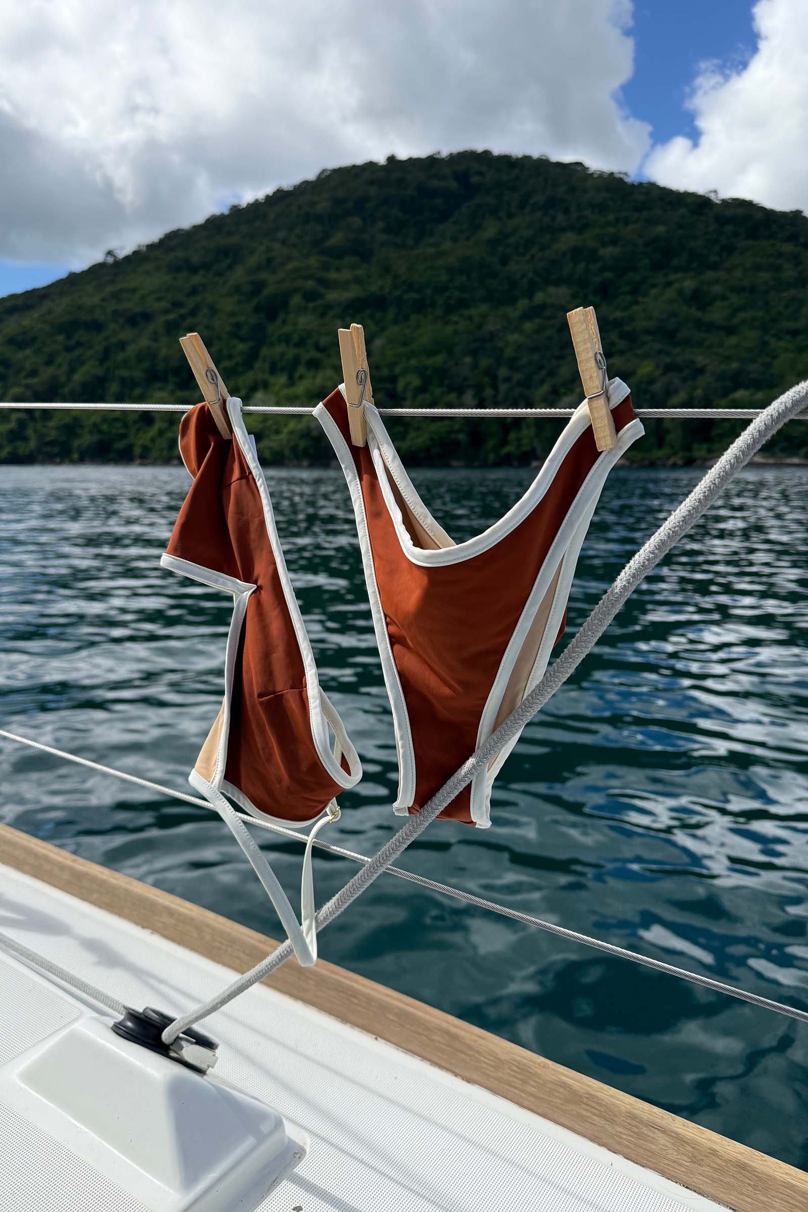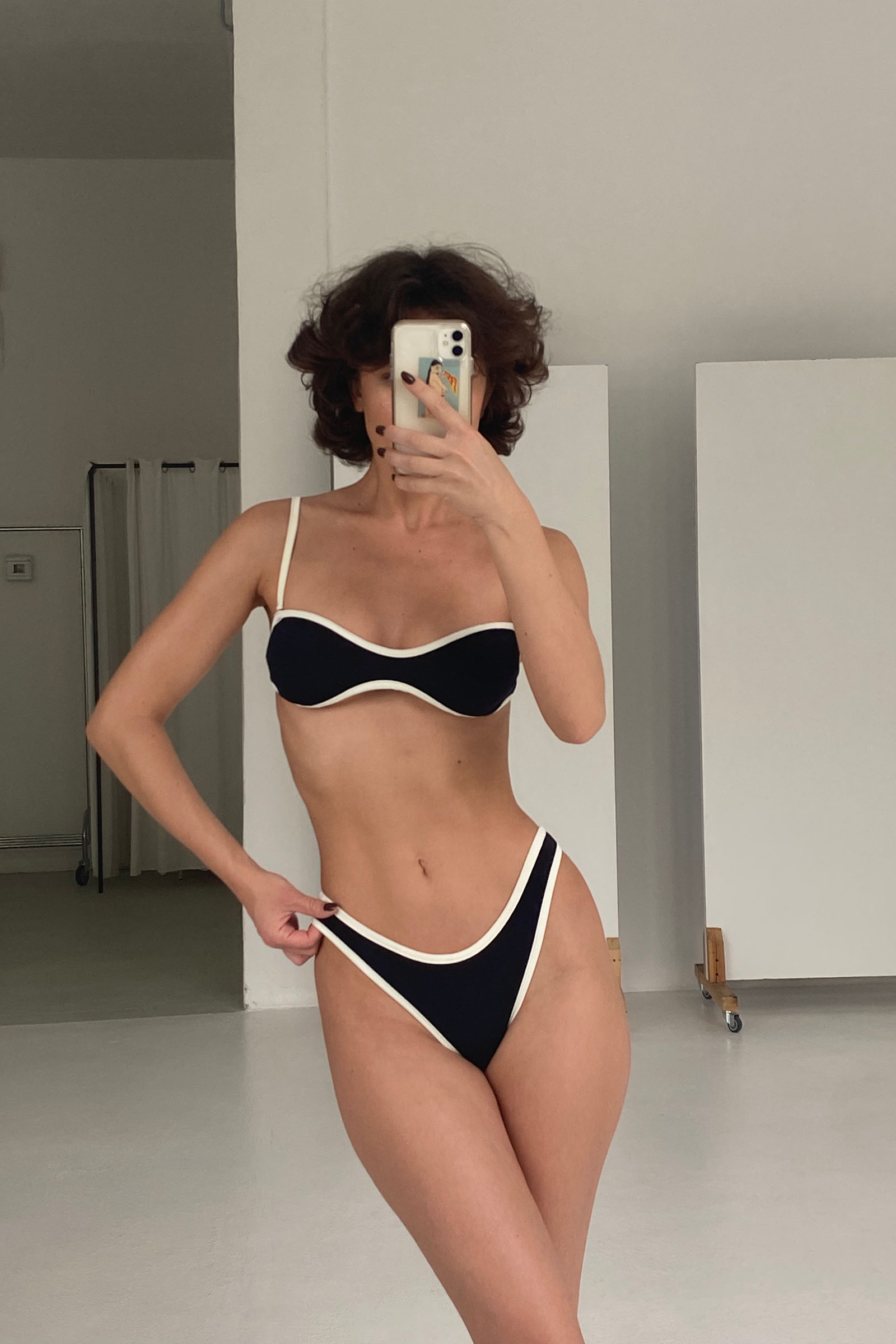 Ида — новая модель раздельного купальника с окантовкой цвета айвори. Плавки на высокой посадке силуэта «галочка» . Модель с подкладом. Сочетайте с топами от моделей Ида и Агла