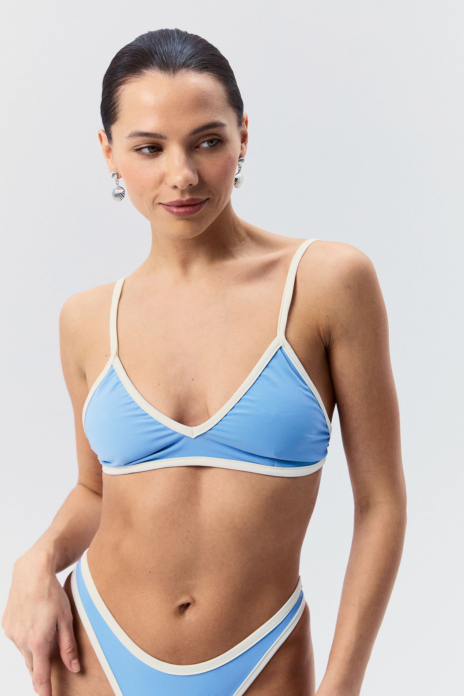 Топ с треугольными чашками, бретели на регуляторах. Сзади топ застегивается за застежку-крючок. В чашечках предусмотрены отверстия для поролоновых вкладышей. Сочетайте с плавками от моделей Агла, Ида и Пенелопа